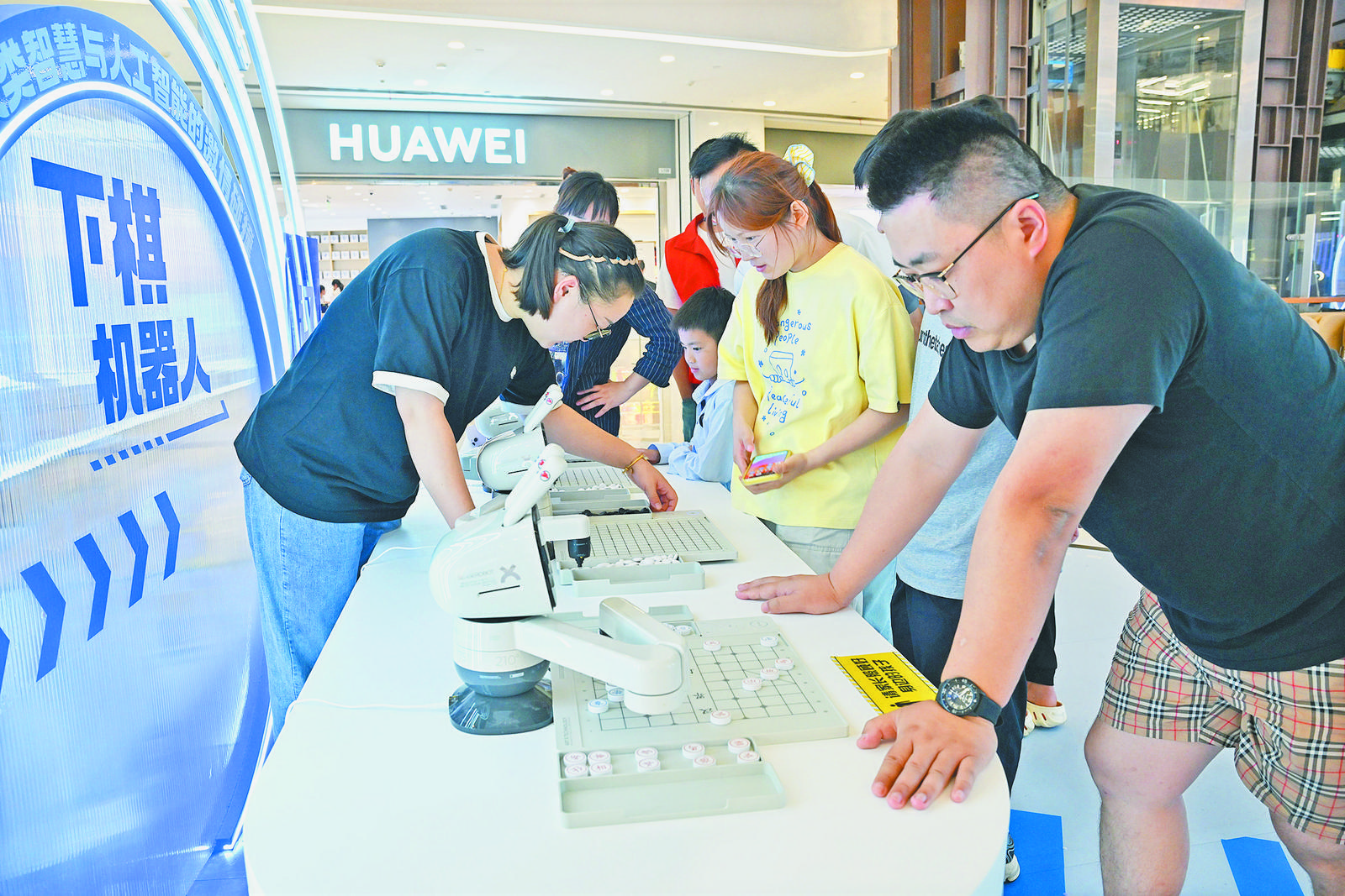 圖為6月2日晚,市民們正和下棋機(jī)器人現(xiàn)場(chǎng)PK圍棋和象棋技藝。