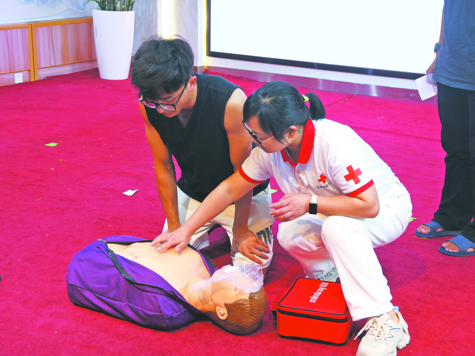 培訓(xùn)會上,市紅十字會二級救護(hù)培訓(xùn)師何杭芳通過情景化教學(xué),系統(tǒng)講解了防溺水急救要點。在隨后進(jìn)行的實操訓(xùn)練中,參與者在培訓(xùn)師的指導(dǎo)下,開展心肺復(fù)蘇操作及自動體外除顫儀使用。