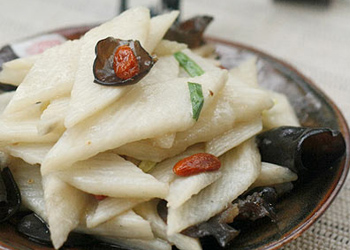 原料:山藥400克、木耳十余朵、枸杞十來粒。 輔料:姜絲、香蔥段少許。 調(diào)料:橄欖油一勺、黃酒一勺、鹽一小勺、雞精一小勺。 做法: 1、準備好原料:木耳泡發(fā)后去蒂,事先用黃酒浸泡枸杞十分鐘,香蔥切段,姜切絲。 2、在燃氣爐上將山藥的燒掉,便于待會兒削皮。 3、在水龍頭下面一邊沖水一邊削皮,動作盡量快。 4、切完片的山藥馬上放到水里,防止氧化。 5、在鍋中倒入油,放入姜絲爆香后先放入山藥翻炒兩三分鐘,然后放入木耳,倒入用黃酒泡過的枸杞。黃酒也一同倒入。翻炒兩分鐘。 6、倒入香蔥、調(diào)入鹽和雞精翻炒均用后出鍋盛盤。 |