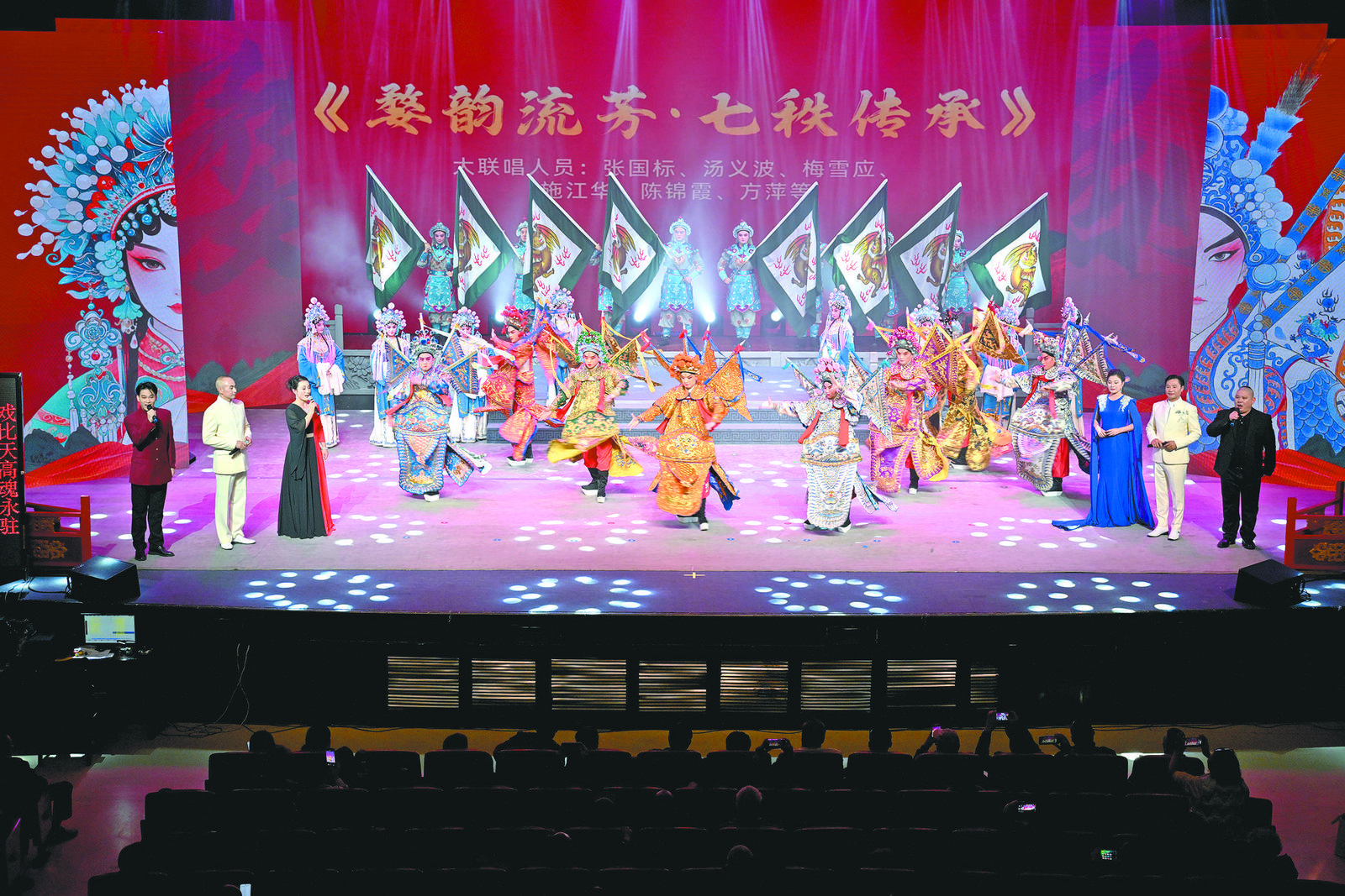 篳路藍縷,七十載婺韻流芳;薪火相傳,新時代長歌向遠。10月24日晚,慶祝義烏市婺劇團成立70周年成果匯演在義烏劇院舉行。 當晚,義烏劇院洋溢著喜慶熱烈的氛圍。晚上7時許,經(jīng)典婺劇《花頭臺》率先拉開演出大幕,多種樂器齊鳴共奏。整場演出由序曲、第一篇章“初心·砥礪同行”、第二篇章“傳承·星光璀璨”、第三篇章“征程·共繪藍圖”以及尾聲等五個部分組成,以婺劇、婺唱、婺韻為載體,通過十多個節(jié)目,唱響婺劇時代之歌。 一方水土一方戲,一聲鄉(xiāng)音一段情。來自義烏杭州育才學校、楊村小學、義亭小學、佛堂實驗幼兒園、銅溪小學孩子們共同演繹的《夢啟婺源》,開啟“初心·砥礪同行”篇章。隨后,經(jīng)典劇目《斷橋》剛?cè)岵实奈鋺驁雒,更是婺劇特色的鮮明體現(xiàn)!稙鮽x》生動演繹了義烏“六義”文化的深厚底蘊。臺上演員通過婺劇“文戲武做”的特點,結(jié)合劇情展示武戲絕活,讓觀眾領略了中華優(yōu)秀傳統(tǒng)文化歷久彌新的魅力。 在“傳承·星光璀璨”篇章,老中青三代婺劇人同臺獻藝,展現(xiàn)劇團薪火相傳的生動圖景!断氘斈辍贰段魇I》《相國志》選段,老一代婺劇演員以扎實功底,贏得陣陣喝彩。婺劇新編歷史劇《烏江渡》榮獲第十六屆浙江省戲劇節(jié)“優(yōu)秀劇目獎”,精彩演出更是將現(xiàn)場氛圍推向高潮。舞臺光影流轉(zhuǎn)間,傳統(tǒng)技藝與現(xiàn)代審美交融共生,映照出婺劇守正創(chuàng)新的發(fā)展脈絡。 在“征程·共繪藍圖”篇章,婺劇《婺韻霓裳》《歸隱》《鐘馗·行路》《鍘美案》等相繼上演。最終,在婺劇大聯(lián)唱《婺韻流芳·七秩傳承》中,兩個多小時的晚會落下帷幕。“太好看了,我特意帶了女兒來看戲!稊鄻颉贰堆泗峁鳌贰稙踅伞返葎∧孔屓丝吹煤苓^癮,特別精彩!”戲迷駱家駿說。 |