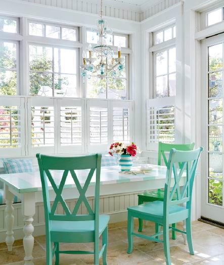 餐廳在客廳旁邊,面積不大,卻被外面灑進來的陽光緊緊包圍。白色的長條形餐桌與白色的透氣窗讓這里的氛圍寧靜優(yōu)雅,為了呼應客廳的主題,餐椅選擇了和沙發(fā)色調相同的藍綠色。此外,水晶吊燈、藍白條的陶瓷罐和海星也突出了餐廳的海洋風味。