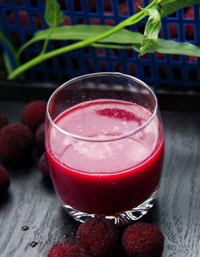 原料: 楊梅、蜂蜜。 做法: 1、將新鮮楊梅摘去果梗雜葉,用清水洗滌干凈,然后放入一盤清水中加1勺鹽,浸泡10分鐘。等蟲子都跑出了,再從新清水洗滌1遍。用干凈的毛巾吸干水分,(或則平鋪在盤中自然晾干水分,大概15分鐘。) 2、將楊梅放入攪拌機(jī),加入一勺蜂蜜,大概7克。攪拌成漿。 3、用過濾網(wǎng)過濾出汁,用調(diào)羹幫助攪拌擠壓,很快就出汁了。 4、新鮮的楊梅汁色澤玫紅,甜中帶著微酸。且非常的干凈衛(wèi)生。放心品嘗。 5、如果覺得濃度太高的話,可以對(duì)適當(dāng)?shù)臎鲩_水,或者加冰塊食用。 6、請(qǐng)適量飲用,一次半杯即可。兒童需稀釋飲用,不宜過量。