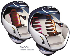 奧迪SNOOK 奧迪SNOOK的設(shè)計師為Tilmann Schlootz。造型靈感來自拳擊手套,并融合戰(zhàn)斗機座艙的設(shè)計理念,完全顛覆傳統(tǒng)汽車外形設(shè)計概念,乘客坐在車內(nèi)會有一種置身于戰(zhàn)斗機中的感覺。