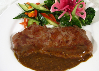 原料:嫩小牛扒(又叫牛仔骨)、紅葡萄酒,鹽,黑胡椒、洋蔥、蘆筍、黃油。