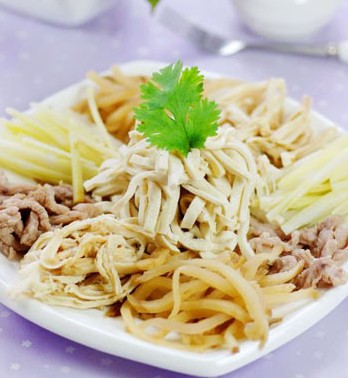 原料: 主料:白豆腐干125g。 配料:熟筍絲15g、榨菜絲15g、熟肉絲15g、熟雞肉絲15g、嫩姜絲20g、香菜1根。 調料:芝麻油1大勺、生抽1茶匙、鹽少許、白糖少許。 做法: 1、將白豆腐干切細絲; 2、備好熟筍絲、榨菜絲、熟肉絲、熟雞肉絲、嫩姜絲; 3、取小碗放入生抽; 4、放少許鹽、糖調成味汁; 5、將切好的豆腐絲放出開水鍋中汆燙2分鐘撈出; 6、分別撒上姜絲、熟筍絲、榨菜絲、熟肉絲、熟雞肉絲,澆上調味汁和芝麻油拌勻即可。 心得分享: 1、干絲要先切片、再切絲,注意選擇有韌性的豆干,以免切碎; 2、豆絲用沸水汆燙,可以去掉豆腥味; 3、料汁要趁熱加入,以免干絲涼后變硬,失去綿軟口感; 4、可根據自己的口味調整配料的種類和用量。