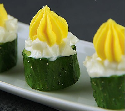 原料:黃瓜、雞蛋。 調(diào)料:色拉醬、鹽、黑胡椒。 事先準(zhǔn)備: 1、雞蛋煮熟后剝?nèi)ぃ训包S蛋白分開(kāi);蛋白切成丁備用。 2、黃瓜切成段。 做法: 1、蛋白內(nèi)加入適量色拉醬。 2、加入一點(diǎn)點(diǎn)鹽。 3、磨入適量黑胡椒粒攪拌均勻。 4、蛋黃先用勺子碾碎,加入一點(diǎn)點(diǎn)鹽,適量色拉醬攪勻成糊狀。 5、黃瓜裝入盤(pán)中,舀適量蛋白鋪在表面。 6、裱花袋內(nèi)裝入花嘴,再裝入蛋黃,在蛋白上擠出花形即可。 啰嗦幾句: 1、色拉醬里含有鹽,所以一點(diǎn)點(diǎn)鹽就足夠了,加多了也較難溶解。 2、蛋黃先碾細(xì)膩后再加色拉醬和鹽,否則很難碾細(xì)膩。 3、造型隨意,可以將黃瓜一起切丁,與蛋黃蛋白一起調(diào)味也是一樣的,隨你喜好。 |