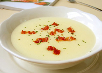 材料: 土豆中型1個(gè)、培根一片足以、洋蔥一小塊、牛奶或奶油適量、黃油適量、法香少許(沒(méi)有就不放,起到的是提香味和點(diǎn)綴的作用) 調(diào)料: 鹽、黑胡椒(分量為個(gè)人獨(dú)享版) 做法: 1、先處理一下材料吧,土豆洗凈,去皮,切成小塊,隨便切一下就行,反正后面也要打成土豆泥;洋蔥切絲,也是隨便切切;培根切碎,切小塊或是切絲都可以;你要有法香的話,再切點(diǎn)法香碎。上次做三明治買(mǎi)的美式經(jīng)典培根,是我覺(jué)得最好吃的培根,比常買(mǎi)的荷美爾培根好吃~ 另外分享個(gè)新土豆去皮的小竅門(mén): 把新土豆放在熱水里浸泡一會(huì)兒,取出再放到冷水中,就很容易去皮了。 2、鍋內(nèi)放入一小塊黃油,這時(shí)要小火,你用平底鍋,或是小湯鍋都可以。 3、黃油融化后,放入洋蔥絲,不停的翻炒,把洋蔥炒軟就行。 4、然后放入土豆塊,再炒一會(huì)。 5、這時(shí)加入清水,水不用加太多,能基本沒(méi)過(guò)土豆就行了,加水只是為了把土豆煮軟煮爛,煮土豆的湯汁可用可不用,所以水不必加的太多。 6、煮土豆的時(shí)候我們煎一下培根,不用放色拉油,它自己就會(huì)出很多的油,煎的時(shí)候要用木鏟不停的翻炒,直到它的顏色變深,肉質(zhì)變脆。 7、像這樣,煎的焦焦的,脆脆的,搭配濃湯吃起來(lái)會(huì)非常的香~ 8、看看旁邊的土豆是不是已經(jīng)煮的差不多了,把煮軟的土豆塊和洋蔥絲盛到攪拌機(jī)里,再加一點(diǎn)點(diǎn)剩下的湯汁,一起攪打成泥,如果你喜歡吃到一粒粒的土豆,就別打得太碎,自己根據(jù)需要處理就行了。 9、把剛才打好的土豆泥湯再倒回到湯鍋中(這時(shí)的湯鍋?zhàn)詈檬强盏,不要還有剛才煮土豆剩下的湯汁),你會(huì)發(fā)現(xiàn)攪打過(guò)的土豆泥非常的粘稠,這時(shí)就加入牛奶吧,根據(jù)你自己的需要,想湯稠點(diǎn)就放少點(diǎn),想稀點(diǎn)就多放點(diǎn),最好不要太稀,會(huì)影響它香濃的口感。你也可以加入奶油,家庭做加牛奶很方便,價(jià)錢(qián)也非常的便宜。最后加入鹽、黑胡椒粉調(diào)調(diào)味,一開(kāi)鍋就算好了,這中間你最好不要偷懶,最好不停的攪拌,以免它糊底。 最后撒上法香和培根就可以喝啦~~ |