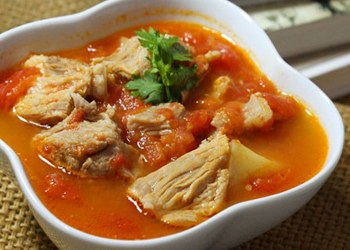 原料:牛腩1斤、土豆2個(gè)、蒜末2湯匙、洋蔥1個(gè)(30克左右),辣椒粉1大匙,西紅柿1個(gè),黃油100克,油一碗 作法: 1.牛腩切小方塊,入滾水中氽燙,去除血水、泡沫,洗凈,瀝干水份。 2.土豆去皮,切麻將牌大小的塊。 洋蔥切絲。 3.起油鍋,下一碗油,將土豆塊炸熟,倒出瀝干油。下黃油,慢火化開(kāi),爆香蒜未、洋蔥絲,投入牛腩炒勻,加水兩碗燒開(kāi),西紅柿切塊放入同燉,轉(zhuǎn)小火燜煮1小時(shí)后,放入土豆及調(diào)味料續(xù)煮20分鐘,燒至湯汁快干、肉爛即可。 |