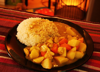 原料: 雞腿2只、土豆一大棵、元蔥一個(gè)、蒜米適量、荷蘭豆50g、牛奶1L、肉骨湯1L、黃油40g、白糖20g、咖喱粉20g、鹽適量。 做法: 1、雞腿,蔬菜切塊備用; 2、熱鍋融化黃油,加入蒜米、咖喱粉,轉(zhuǎn)小火爆香; 3、加入雞腿肉、白糖,翻炒2分鐘; 4、下入元蔥,繼續(xù)翻炒2分鐘; 5、加入土豆翻炒均勻,所有材料移至大鍋,倒入肉骨湯和一大盒牛奶,以沒過全部食材為止; 6、加鹽調(diào)味,大火燒沸; 7、轉(zhuǎn)文火,繼續(xù)熬30分鐘,直到湯汁變濃稠,雞肉和土豆都酥爛; 8、最后將濃郁的咖喱澆到熱米飯上即可 |