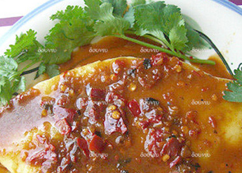 3、另取一鍋,加一點底油,燒熱后,加一茶匙半的郫縣豆瓣,醬油、醋、白糖,做成魚香味的澆汁;
