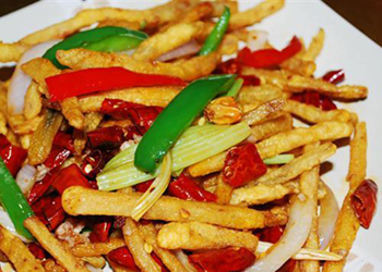 3、鍋中放油用中火燒至六成熱,下干辣椒段稍炸后,倒入土豆絲改大火煸炒。