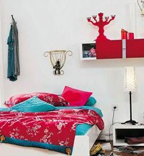 這是較為青春活力的一款,紅色與綠色相搭的床品,兩大亮色的搭配卻不顯沖撞,反而讓整個(gè)居室感覺變得溫馨而又充滿個(gè)性。