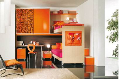 搭配點(diǎn)評(píng):橙色給人甜蜜的感覺(jué),泛著香橙的淡淡清香,使得臥室像極了童話城堡。該臥室以橙色為主,夾雜著黑色跟米黃色,適用男孩房。 |