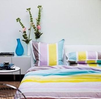 淡紫色與水藍(lán)色過渡的主調(diào)彩色條紋裝飾,使得床品整體簡潔而具動感。 淡紫色與水藍(lán)色過渡的主調(diào)彩色條紋裝飾,使得床品整體簡潔而具動感。大膽而不張揚(yáng),時尚而不傲氣。與簡約的白色床頭及空間搭配和諧。配上清涼金屬條靠背椅及現(xiàn)代家具,擺放上設(shè)計感十足的花瓶裝飾,完美地打造出輕松休閑的臥室一角。