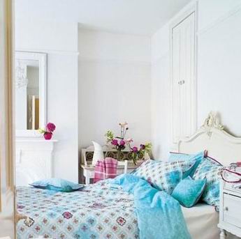 藍(lán)色臥室?guī)砗叺那逅杏X 淡藍(lán)色與淺粉色的床品搭配天藍(lán)色的方毯,奠定了臥室的藍(lán)色情調(diào),帶來了湖邊的清爽感覺。 |
