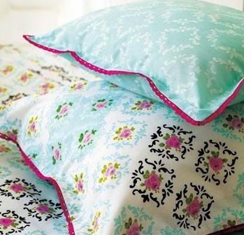 抽象的小提花紋樣床品 抽象的小提花紋樣進(jìn)行了四方連續(xù)的排列,布滿床品表面,中間有暗紫,粉色,藍(lán)色等色彩區(qū)分與強(qiáng)調(diào)。枕套分為同樣裝飾花紋與單純的藍(lán)色兩種,與被面相搭配。邊緣做玫瑰色圓邊處理,結(jié)實(shí)而精美。
