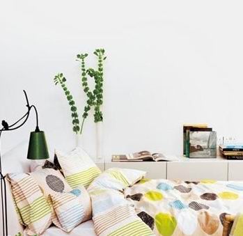 幾點(diǎn)鮮亮的黃綠色條紋及點(diǎn)狀圖案使臥室充滿了清涼意 床品采用了具有跳躍感的大圓點(diǎn)圖形,被里及局部細(xì)節(jié)搭配有多種單色的細(xì)條紋,打破圖案的單調(diào)性。淡調(diào)的底色避免了與白色空間及床頭的色彩重復(fù),也不影響其襯托明快圓點(diǎn)的作用。幾點(diǎn)鮮亮的黃綠色條紋及點(diǎn)狀圖案,與嫩綠的綠植、臺燈、茶杯等相呼應(yīng),使臥室充滿了清涼意。 |