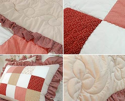 紅白相間的格紋荷葉邊,結(jié)合用不同紅白色正方形布藝拼花的效果,絎縫花紋結(jié)合出不同的圖樣,讓被子的花色更加豐富立體。