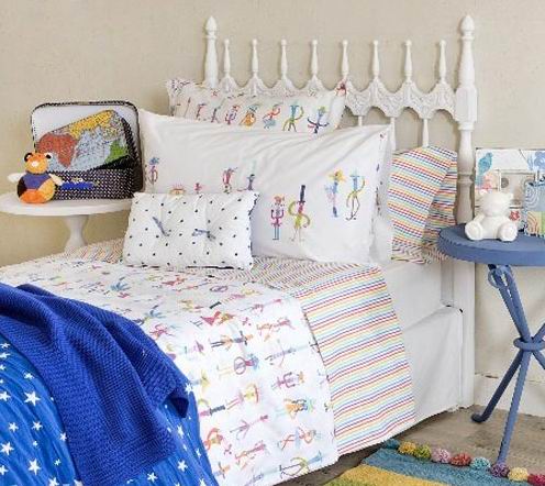 同樣的星空元素,用藍(lán)色作為底色就顯得更加接近夜空了。在白色的床單上用卡通小人和彩色條紋作為點(diǎn)綴,讓素雅中不失童趣,更符合孩子審美的過(guò)渡期。