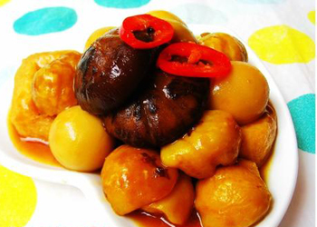 原料:香菇(鮮)800克,鵪鶉蛋500克,金華火腿10克,鹽2克,雞油20克,黃酒5克,味精1克,淀粉(豌豆)15克 做法: 1.將大冬菇放入溫水中泡透,去蒂,用清水洗凈,擠去水,放砧板上,在有褶皺的一面撒上干淀粉10克,然后將鵪鶉蛋磕入冬菇內(nèi),撒上火腿末少許,移放平盤中,上籠蒸熟取出. 2.炒鍋置旺火上,倒入上湯,烹入紹酒,放精鹽、味精燒沸用水淀粉10克(淀粉5克加水)勾芡,灑入芝麻油,出鍋將調(diào)好的芡汁澆在平盤上即成。 核桃雞