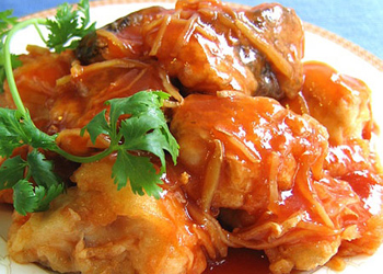 原料: 草魚一條,雞蛋1個,酒3湯匙(45ml),干淀粉2湯匙(30g),番茄醬2湯匙(30ml),姜絲15g,綿白糖50g,米醋3湯匙(45ml),鹽1茶匙(5g),濕淀粉1湯匙(15ml) 做法: 1.草魚去掉魚頭、鱗片和內(nèi)臟,清洗干凈,沿背骨從中間片開,將兩側(cè)的魚肉剔下,再斜刀片成薄塊。調(diào)入料酒腌制20分鐘。 2.雞蛋磕入碗中,加入干淀粉,攪打成蛋糊。 3.鍋中入油,中火燒至七成熱時,將魚片均勻地裹上蛋糊。 4.入油炸至金黃色撈出魚塊。 5.瀝去油分。擺入盤中。 6.鍋內(nèi)留少許油,放入姜絲煸炒幾下。 7.依次加入醋,綿白糖、番茄醬、鹽和40ml清水,攪動幾下,再調(diào)入濕淀粉,用鏟子沿一個方向攪動,調(diào)成糖醋汁。 8.將調(diào)好的糖醋汁迅速淋在炸好的魚片上即可。 |