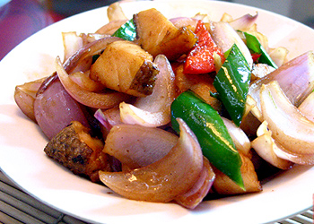 原料: 銀鱈魚1塊,洋蔥1個,青尖椒1個,生抽適量,鹽適量,黑椒粉適量,紅尖椒1個 做法: 1.將銀鱈魚切塊,洋蔥,辣椒切好待用。 2.起油鍋,將銀鱈魚煎至兩面金黃待用。 3.爆香蒜頭,下洋蔥、辣椒炒香并炒至斷青。 4.將煎好的銀鱈魚重新下鍋,炒勻,下鹽、生抽、黑椒粉調好味的。炒熟即可出鍋 |