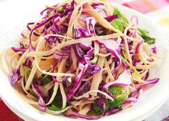 原料: 紫甘藍(lán)、豆腐皮、香菜、蒜末、花椒、蔥末、白醋、白糖少許、鹽、油各適量。 做法: 1、紫甘藍(lán)和豆腐皮分別洗凈,切成絲,香菜洗凈切斷兒。 2、豆腐絲、紫甘藍(lán)和香菜放一盆中,再把蒜末放表面。 3、炒鍋內(nèi)放油,放花椒炸香撈出。蔥末放到油里,炸香。 4、炸好的蔥油倒入放有豆腐絲和紫甘藍(lán)等的盆中。 放白醋、白糖和鹽攪拌均勻即可。 |