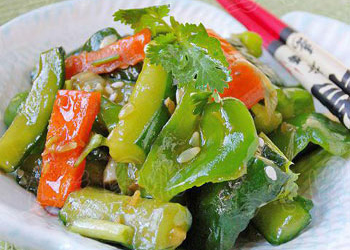 原料:黃瓜、青椒、胡蘿卜、香菜段、色拉油適量、蠔油、鹽、白糖、蔥末、姜末、蒜末、芝麻少許。 做法: 1、黃瓜胡蘿卜清洗干凈控水。 2、把黃瓜切成筷子粗的條,胡蘿卜也切成條(半個(gè)胡蘿卜就夠了)。 3、青椒清洗干凈控水。 4、把青椒切成小塊備用。 5、所有切好的蔬菜放入盤中,加入適量鹽腌制半天時(shí)間,中間要翻動(dòng)幾次。 6、經(jīng)過鹽的腌制會(huì)有很多水分被殺出來,然后用手把水分?jǐn)D干。 |