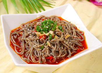 原料: 蕨根粉100g、新鮮小辣椒5個、香菜2棵、醋4茶匙、鹽1/4茶匙、生抽1茶匙、香油1/2茶匙。 做法: 1、香菜和辣椒洗凈備用; 2、將蕨根粉提前2小時浸泡于涼水中,小紅椒切片,香菜切段備用; 3、煮鍋中燒開適量水,水開后關火,將浸泡過的蕨根粉倒入鍋中,蓋上蓋子,不用開火,在開水中浸泡10分鐘; 4、蕨根粉在開水中浸泡至無硬芯后撈入裝有涼開水的大碗中,浸涼備用; 5、小碗中加入切好的辣椒,再分別加入醋、生抽、鹽和香油攪拌均勻; 6、浸涼的蕨根粉撈出,濾掉多余的水分裝盤,將剛才配好的調料加入后,攪拌均勻即可食用。 |