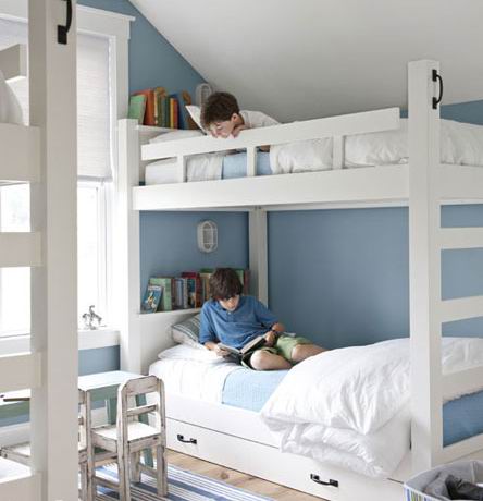 搭配繽紛臥室之藍(lán)色 淺藍(lán)和淺白的海軍風(fēng)搭配,是越來越多年輕人近年來的大愛,無論從服飾還是到家居,這整體夏季的吹起了一股清新的海洋之風(fēng)。這樣的臥室顏色設(shè)計(jì),特別適合打造男孩子的兒童臥室空間,白色家具加上藍(lán)色的墻面和地毯鋪設(shè),簡(jiǎn)單的色彩搭配游戲,就能讓頑皮男孩的房間瞬間明快起來。另外,在閣樓的小戶型里,放置一張不太占空間的雙人木床,也不失為一個(gè)很好的兒童臥室搭配選擇。 |