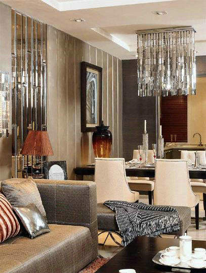 雖然是一個(gè)系列的燈飾,但是在餐廳選用吊燈,在客廳選用壁燈,功能差別一下子被分開了,而且還有一種區(qū)域之間相互呼應(yīng)的感覺。