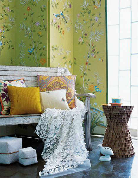 將白色的戶外長椅置入室內(nèi),有種將自然帶到房間的感覺。帶有花朵的白色窗紗會為房間增加輕柔之感。由紙制成的茶幾玩的就是環(huán)保概念,鵪鶉造型燭臺則能給房間帶來自然情趣,另外一些綠色或天然質(zhì)地的小物件,都能給人以自然之感。