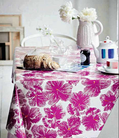 是否因為工作太忙碌,沒有時間在家玩裝飾?其實,只要在餐桌上鋪上一塊印花油布就是最快捷的方法。你可以根據(jù)個人喜好,選擇自己喜歡的印花圖案做成油布,餐桌上立刻開出鮮花朵朵。