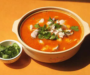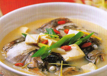 原料: 枸杞子20克,草魚(yú)頭1只,姜5克,鹽5克,胡椒粉3克,猴頭菌(干品)50克,紹酒10克,蔥10克,味精3克。 做法: 1.枸杞子去果柄、雜質(zhì),洗凈;猴頭菌在溫水中浸泡2小時(shí)發(fā)開(kāi),去蒂頭、雜質(zhì),洗凈,切片;草魚(yú)頭去鰓、鱗,洗凈,剁成4塊;姜切片,蔥切段。 2.枸杞子、猴頭菌、草魚(yú)頭、紹酒、姜、蔥放入燉鍋內(nèi),加清水2800毫升,置武火上澆沸,再用文火燉煮30分鐘,加入鹽、味精、胡椒粉即成。 |