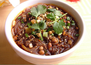 原料: 紅薯粉條150克 豬骨高湯(1碗) 干黃豆15克 花生15克 芽菜末10克 油豆泡4個(gè) 綠葉蔬菜2條 碎豬肉末50克放在高湯內(nèi)煮熟 姜蓉1/2茶匙 蒜蓉1/2茶匙 香水芹菜切碎(1茶匙)香菜切碎(1茶匙)香蔥碎(1茶匙) 醬油1大匙 香醋1大匙 鹽1/4小匙 芝麻香油1/2茶匙 炒熟白芝麻 1/4小匙 花椒粉1/4茶匙 雞精1茶匙 白胡椒粉1/4茶匙 特制油辣椒1大匙 做法: 高湯做法;豬大骨 500克,姜片3片,清水12碗, 先用冷水將豬骨氽燙洗凈,重新加清水12碗,姜片3片,大火煮開后轉(zhuǎn)小火煲約2小時(shí),加入剁碎的五花肉末煮約20分鐘即可。 油辣椒的做法;取2大匙特細(xì)辣椒粉放入碗內(nèi),加入8顆完整的花椒粒,把鍋內(nèi)油燒熱后倒入碗內(nèi)(倒時(shí)會(huì)冒細(xì)泡)待汽泡消后,加入一大匙生抽,一小匙芝麻醬,一小匙芝麻香油調(diào)均即可。 1.干黃豆用冷水浸泡三小時(shí),紅薯粉條用溫水浸泡二十分鐘。 2.鍋內(nèi)冷油,放入瀝凈水的黃豆溫油小火炸至酥脆,瀝凈油備用。 3.鍋內(nèi)冷油,放入花生溫油小火炸至酥脆,瀝凈油去皮碾碎備用。 4.取2大匙特細(xì)辣椒粉放入碗內(nèi),加入8顆完整的花椒粒,把鍋內(nèi)油燒熱后倒入碗內(nèi)待汽泡消后,加入1大匙生抽,1小匙芝麻醬,1小匙芝麻香油調(diào)均即可。 5.鍋內(nèi)燒開水,把泡軟的紅薯粉條放入燙熟撈起瀝凈水。 6.碗內(nèi)先放1/3的高湯及所有調(diào)味料調(diào)勻,放入紅薯粉條,再灑上酥黃豆,碎花生,香菜,香蔥,油辣椒,燙熟青菜,最后把湯水及肉末加滿在碗內(nèi)即可。 |