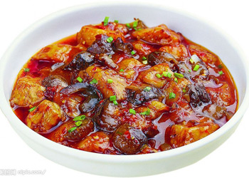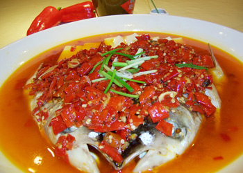 原料: 花鰱魚頭一個,剁椒兩大勺,蘇子葉四片,高度白酒少許,蔥少許,姜少許,蒜少許,食用油少許,鹽少許,雞精少許,料酒少許 做法: 1.新鮮花鰱魚將魚頭留下,去腮洗凈,取鹽、姜末、高度白酒均勻的涂抹在魚頭上腌制半小時; 2.鍋內(nèi)油燒至七成熱,放入剁椒和蘇子葉炒出香味,其間加入料酒; 3.將炒好的剁椒澆至魚頭的反面,倒扣后魚頭正面朝上; 4.將剩余的剁椒均勻的澆至魚頭的正面,另支蒸鍋,水開后蒸至15分鐘即可出鍋,灑上蔥花即可。 |