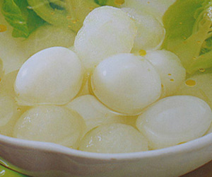 原料: 鴿蛋10個(gè),冬瓜200克,芥菜心100克,精鹽、胡椒粉,雞精、白醋、姜汁,高湯各適量。 做法: 1、冬瓜去皮,挖球形。芥菜心洗凈,一切為二。 2、鴿蛋洗凈,加適量清水煮熟,放入冷水中略泡,撈出去皮。 3、湯鍋中加入高湯煮沸,下入冬瓜、鴿蛋、芥菜心,精鹽,煮至冬瓜透明時(shí)離火。加雞精,白醋、姜汁、胡椒粉調(diào)味即可。 |