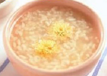 原料: 玉米粒150克,紅蘿卜60克,咸蛋黃2只,蔥1根,油,鹽適量,料酒少許 做法: 1.將咸蛋黃蒸熟,搗碎,加入蔥白碎備用; 2.紅蘿卜切丁,加入少許鹽備用; 3.鍋內(nèi)放入油,燒熱后倒入咸蛋黃泥,爆香,再加入料酒拌勻 4.倒入玉米粒和紅蘿卜丁翻炒1分鐘,撒上蔥花即可 菊花養(yǎng)生粥