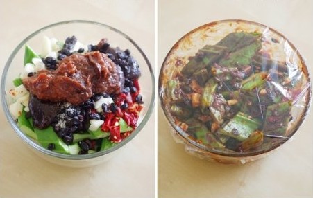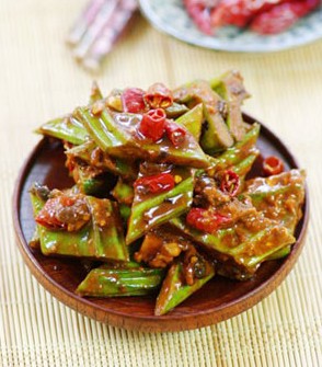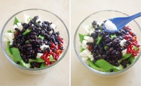1、將刀豆放入一只干凈的大碗,加入蒜末、辣椒碎和豆豉; 2、加入糖和鹽; 3、加入豆瓣醬和辣椒醬; 4、攪拌均勻,蒙上保鮮膜,放入冰箱,腌制一星期即可食用。