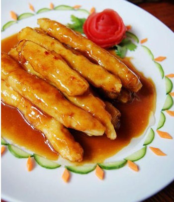 13、將芡汁淋在冬筍條上即可。