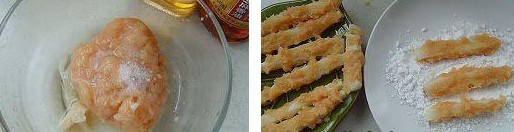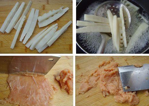 做法: 1、將冬筍去皮,切條。 2、鍋中水燒開,下入冬筍條汆透取出。 3、雞胸肉去筋膜。 4、用刀背捶成蓉。 5、雞蓉放入碗中,加入雞蛋清、豬油、水淀粉、鹽、少許水,攪拌均勻制成雞糝。 6、將瀝干的冬筍條上裹上一層雞糝,再蘸上薄薄一層生粉。