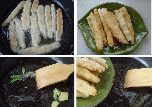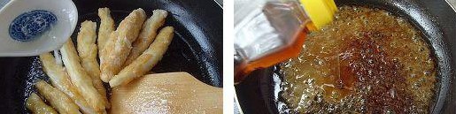 7、逐一放入5成熱油鍋炸制。 8、炸至淡黃色時撈出瀝油。 9、鍋置火上油燒熱,放入蔥姜煸香,白糖炒至呈現(xiàn)琥珀色。 10、揀出蔥姜片,下入冬筍條。 11、調(diào)入料酒、鹽、醪糟汁燒至冬筍入味。 12、冬筍條盛出裝盤,湯汁勾芡,起鍋時淋入香油。