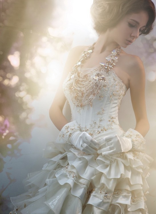 充滿華麗與金色光耀的拜占庭色彩,創(chuàng)造出美神般精美絕倫的水晶華衣羅馬拜占庭,讓浪漫主義滲透到每一個建筑符號奢華獨特的金棕色水晶,結(jié)合精致的刺繡工法,縫紉出如海浪波動的荷葉層層堆棧,其高低層次強調(diào)出線條美感,馬甲上衣利用精致水晶鑲嵌工藝搭配花型珊瑚,輔以圓滑線條及垂褶細節(jié),再鑲上菱形玫瑰色的粉水晶及透明的多邊立體水晶,藉由不同素材及層次的鑲嵌完美打字哦出獨一無二的立體奢華。