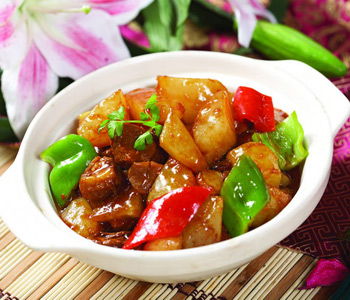 原料: 白蘿卜,牛腩,蔥姜蒜,料酒,醬油,雞精,八角,甜面醬,豆瓣醬,高湯,胡椒粉,干生粉. 做法: 1.牛腩切塊;白蘿卜去皮,洗凈,切塊;蔥切段;姜切片;大蒜切末備用。 2.鍋中加半鍋水燒開(kāi),放入牛腩煮滾,撈出浮油,加蔥段和姜片,小火煮半小時(shí),撈起瀝干。 3.鍋中另倒2大匙油燒,爆香姜末和蒜末,加入甜面醬、豆瓣醬炒勻,放入牛腩、白蘿卜、八角及料酒、醬油、糖、高湯、胡椒粉拌炒,盛入煲鍋中,大火煮沸后改小火煮至肉爛,再加干生粉勾芡,即可端出。 |