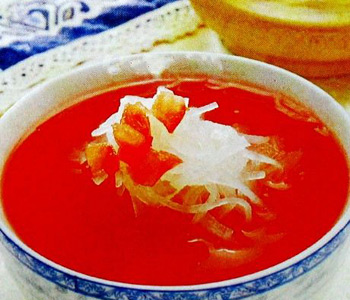 原料: 用料番茄150克,番茄醬150克,白蘿卜400克,精鹽、味精、豬油、面粉各適量。 做法: 1、番茄洗凈切小塊,白蘿卜去皮切細(xì)絲。 2、豬油放人鍋內(nèi)燒熱,加面粉攪拌成糊狀,再放番茄醬炒勻,待炒出紅油時(shí)加入蘿卜絲翻炒片刻,倒入適量清水,用小火煮10分鐘,下番茄塊,煮沸后加精鹽、味精調(diào)味即成。