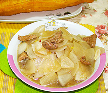 原料: 白蘿卜450克, 雞蛋120克,木耳(干)40克,調(diào)料:花生油30克,淀粉(豌豆)4克,白砂糖8克,大蔥5克,姜5克,鹽2克,味精1克 做法: 1.蘿卜煮熟去皮切成薄片;蔥切成段;姜切成片淀粉加水適量調(diào)勻成水淀粉備用。 2.雞蛋打散,加水淀粉攪成糊狀,與蘿卜片拌勻,加入沸水鍋中氽一下?lián)瞥觥?/P> 3.花生油倒入炒鍋中燒熱,放入蘿卜翻炒,再放入蔥段、姜片、白糖、精鹽、浸發(fā)木耳和味精,炒拌均勻即可。 |