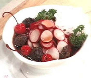 原料: 小蘿卜, 話梅,鮮姜,紅茶粉,櫻桃, 鹽,白糖,蜂蜜,桂花醬,紅葡萄酒 做法: 1、將小蘿卜洗凈切成片,用鹽腌制一下,姜切絲; 2、將話梅加水、姜絲、桂花醬、紅葡萄酒、白糖、紅茶粉煮開,關(guān)火后加少許蜂蜜,盛出晾涼; 3、將腌制好的蘿卜片放入話梅汁中浸泡2個(gè)小時(shí)即可食用,也可將櫻桃一同放入食用。 |