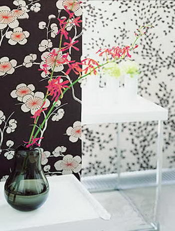 充分體現(xiàn)東方文化魅力的梅花壁紙,點(diǎn)綴家居文雅的氣質(zhì),又與花瓶中艷麗的花枝相映襯。連接抽象的黑點(diǎn)圖案壁紙,又結(jié)合了現(xiàn)代的氣息。最能帶給人涼爽感受的,莫過于玻璃與金屬家具。不但觸感涼爽,而且反光程度高。在白色鐵藝桌上并列擺放三個白色的瓷杯做裝飾,更有特別的效果。