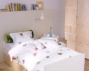 簡約的單人臥室。床下的小抽屜可以方便收納,床頭的隔板和床邊的邊柜也很容易置辦。白底小花的床單非常清爽。如果是在外租房的女孩子,這樣簡單又不失溫馨的搭配應(yīng)該很適合你吧!