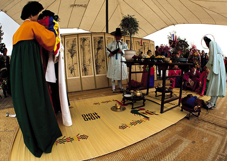韓式婚禮的證婚儀式與西方相似,新人必須面對牧師接受神的祝福。之后是一段正宗的朝鮮族儀式,新人穿韓服入場給父母行大禮吃雞蛋飯,(雞蛋埋在米飯里,新郎若能將筷子一次戳中雞蛋,寓意能生男孩)。然后,新郎擰雞脖,象征著男性的權(quán)威。還有個環(huán)節(jié),拋葫蘆瓢,如果瓢扣在地上表示生男孩,如果瓢口向上表示生女孩。